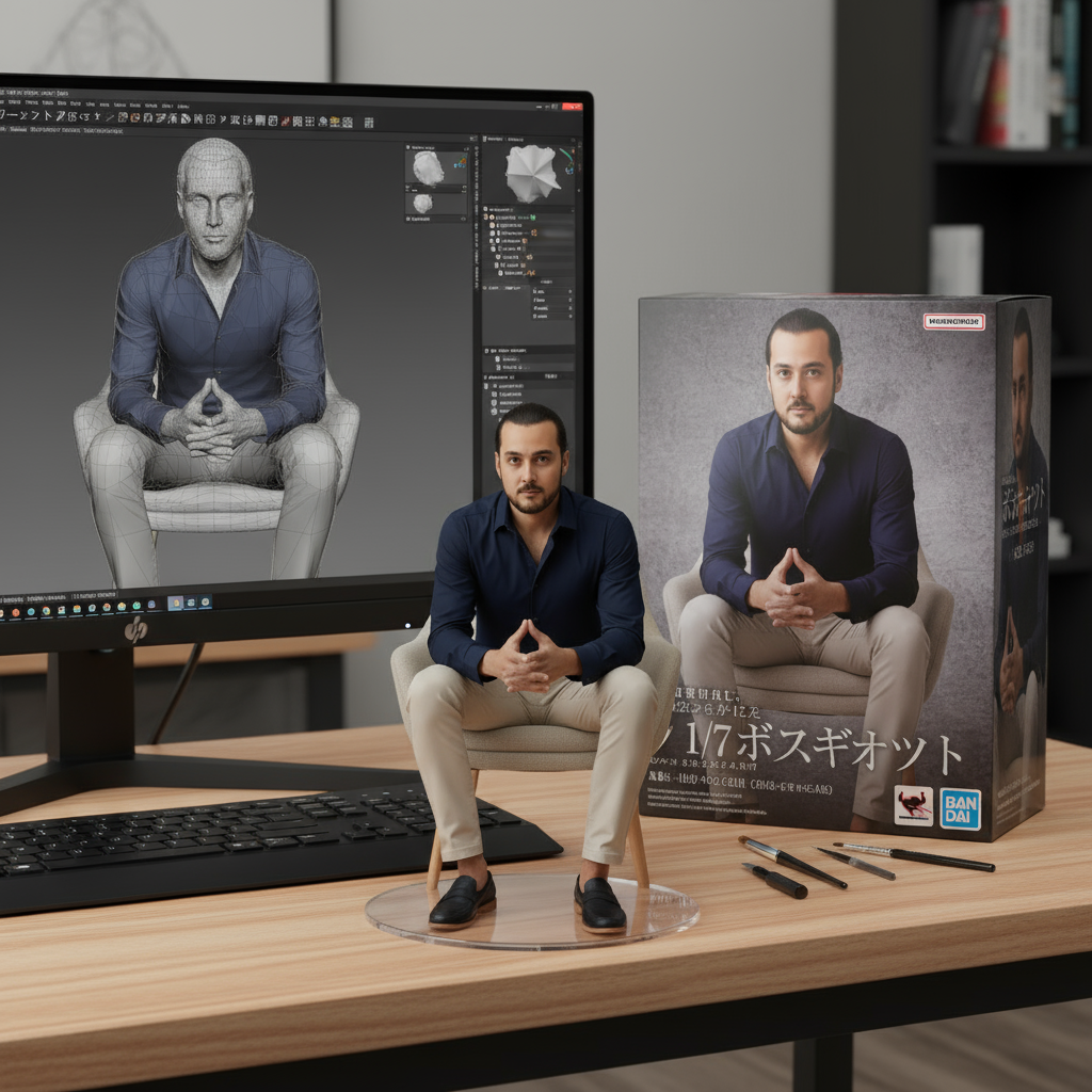 Platzieren Sie neben dem Computerbildschirm eine Spielzeugverpackungsbox im BANDAI-Stil, die mit dem Original-Artwork bedruckt ist.