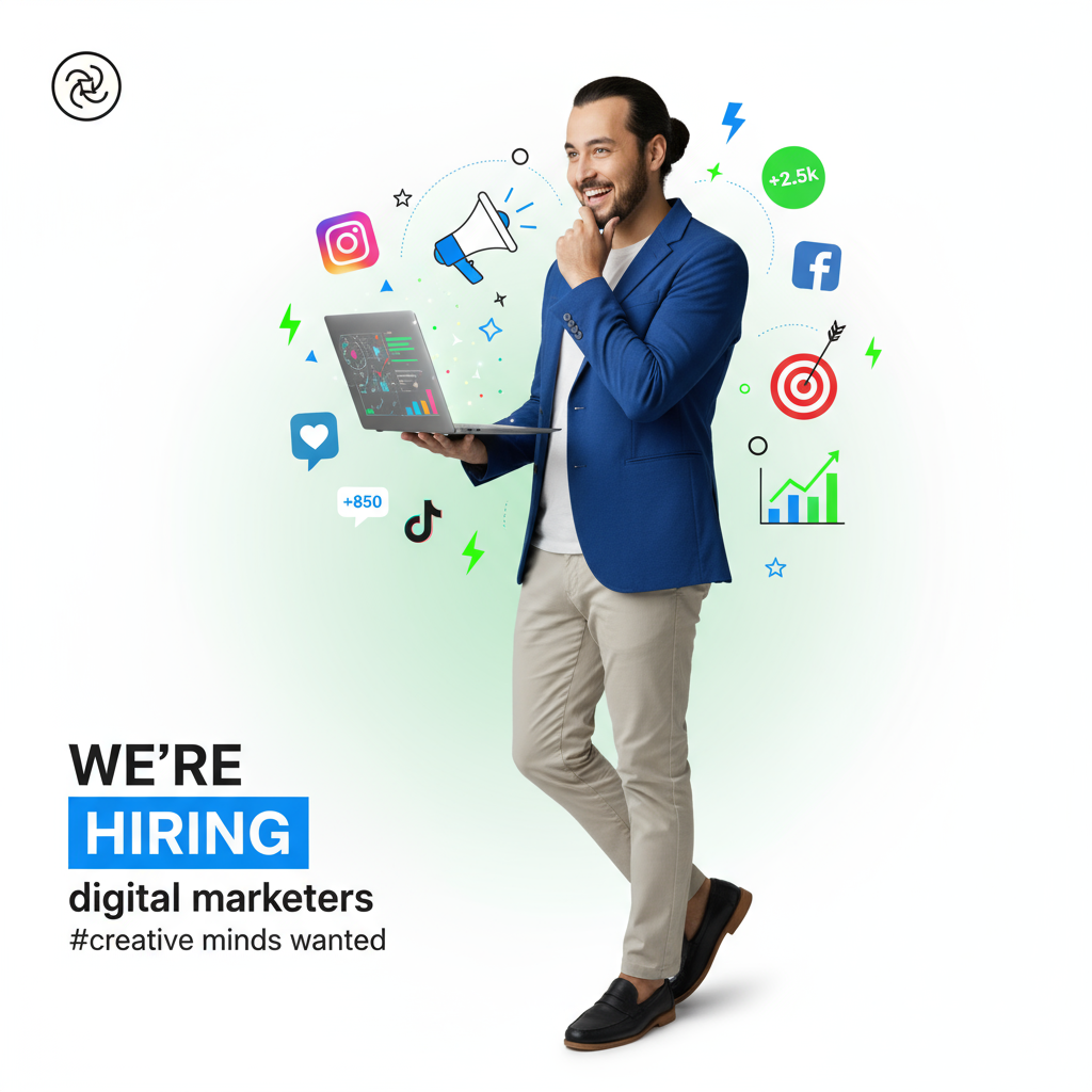 Auf der linken Seite befindet sich eine auffällige Typografie: „WE’RE HIRING” (Wir stellen ein), wobei „HIRING” in einem elektrisch blauen Kasten hervorgehoben ist, gefolgt von „digital marketers” (Digital-Marketing-Experten) und „#creative minds wanted” (Kreative Köpfe gesucht) in einer modernen serifenlosen Schriftart. Oben links befindet sich ein Symbol für eine Kampagne oder Strategie. Die Gesamtästhetik ist innovativ, datengesteuert und dennoch kreativ, mit der Energie der professionellen Personalbeschaffung von LinkedIn. Fotorealistische Darstellung mit lebendiger, ansprechender Beleuchtung, im Stil einer Digitalagentur und mit einer modernen Ästhetik für die Gewinnung von Marketingtalenten.