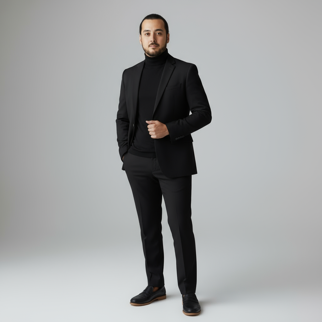 Studiofotografie von mir in einem schwarzen Anzug, schwarzem Rollkragenpullover.