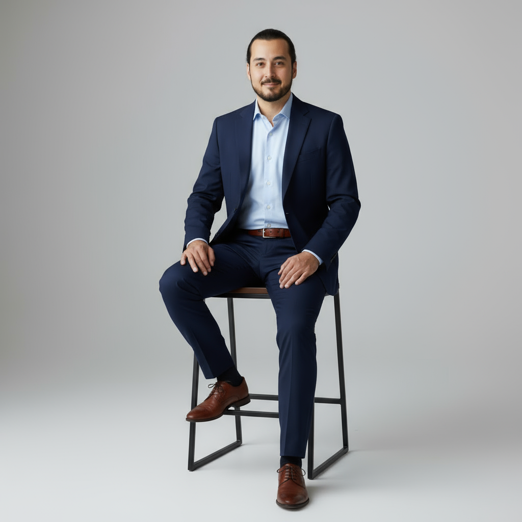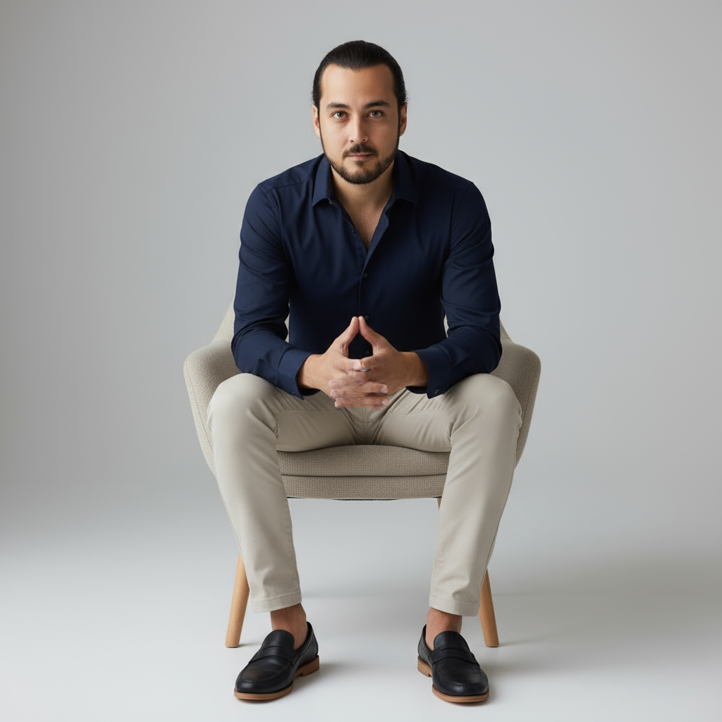 Studioporträt eines selbstbewussten Mannes, der auf einem modernen beigen Sessel mit Holzbeinen sitzt, leicht nach vorne gebeugt und die Hände gefaltet. Er trägt ein dunkelblaues Hemd mit offenen Knöpfen, hellbeige Slim-Fit-Hosen und schwarze Slipper mit hellbraunen Sohlen. Er hat kurzes, dunkelbraunes, strukturiertes Haar, einen gestutzten Vollbart, gebräunte Haut und einen intensiven, selbstbewussten Blick in die Kamera. Der Hintergrund ist minimalistisch hellgrau mit sanftem Farbverlauf und gleichmäßig mit sanftem, natürlichem Studiolicht ausgeleuchtet. Die Stimmung ist filmisch und moderedaktionell, mit hohem Realismus und feinen Details. Aufgenommen mit einem 50-mm-Objektiv bei f/2.8, vertikaler Rahmen, Ganzkörperkomposition.