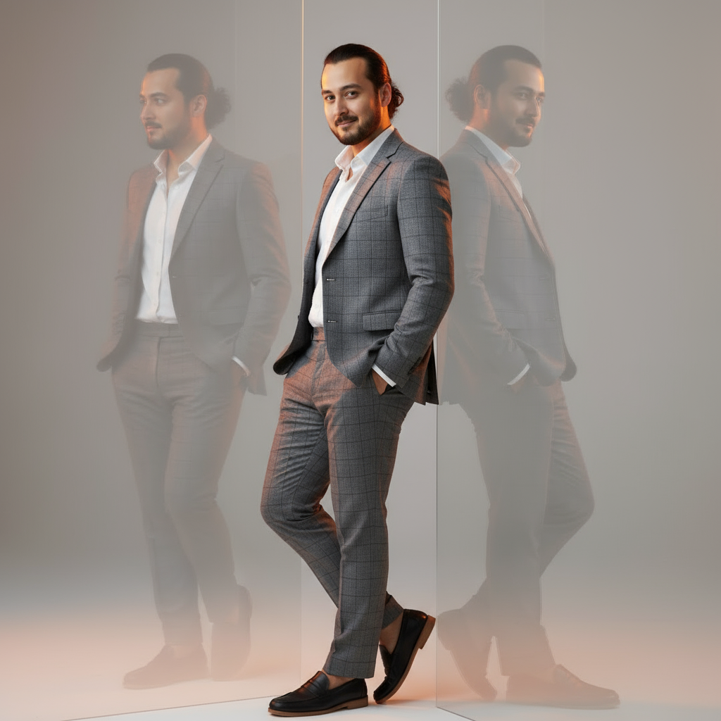 Outfit: maßgeschneiderter grauer Karoanzug, schwarze Slipper. Pose: Hand in der Tasche, sanftes, selbstbewusstes Lächeln.