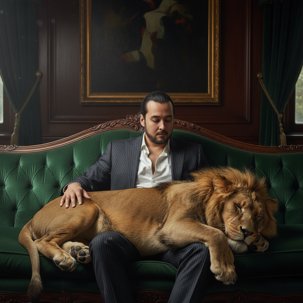Eine Hand ruht lässig auf dem Rücken der Katze, die andere auf der Armlehne des Sofas. Er trägt ein dunkles, elegantes Outfit: entweder einen fein Nadelstreifenanzug oder ein Seidenhemd mit offenem Kragen… eine Aura der Ruhe und Autorität, seine Präsenz strahlt eine ruhige, nicht aggressive Kraft aus.