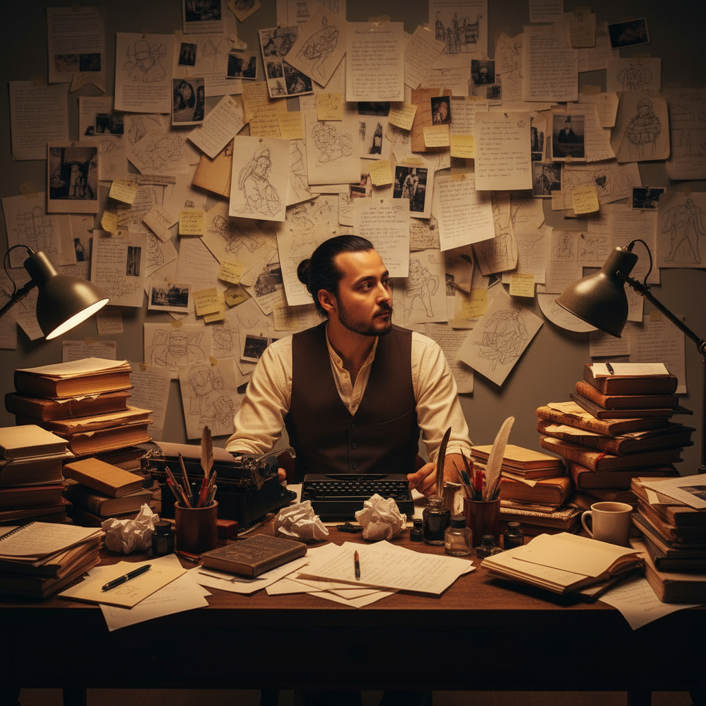 Er trägt klassische/bescheidene Schriftsteller-Kleidung, wie ein langärmeliges Hemd und eine schlichte Weste. Auf dem Tisch liegen Stapel von Büchern, Notizbüchern, verstreuten Papieren, Stiften und Tintenfässern, die den Eindruck intensiver intellektueller Arbeit und kreativen Flusses vermitteln.