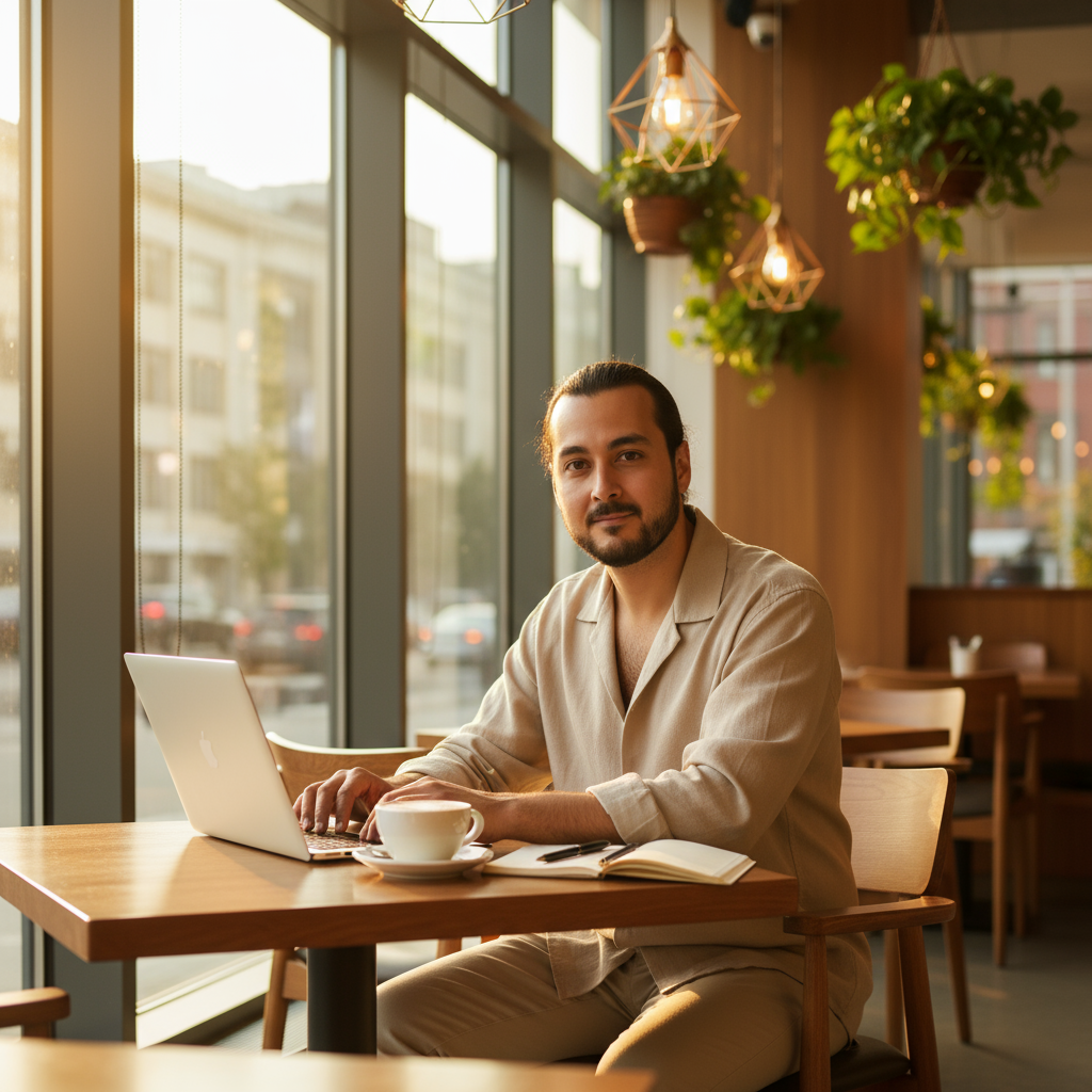Die Szene zeigt eine Person, die in einem modernen, hell beleuchteten Café sitzt und an einem silbernen Notebook arbeitet, mit einer Tasse Kaffee mit Latte-Art auf dem Tisch. Daneben liegen ein Notizbuch und ein Stift, die eine gemütliche und elegante Arbeitsumgebung schaffen.
