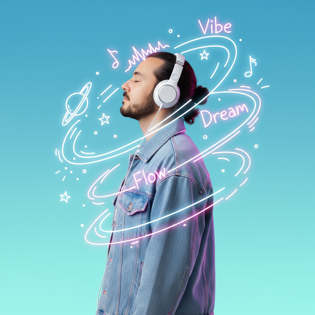 Umgeben Sie ihn mit handgezeichneten Kritzeleien aus fließenden Noten, Sternen, Planeten und abstrakten Wellen, die alle um ihren Kopf kreisen, als würde sie durch eine musikalische Galaxie schweben.