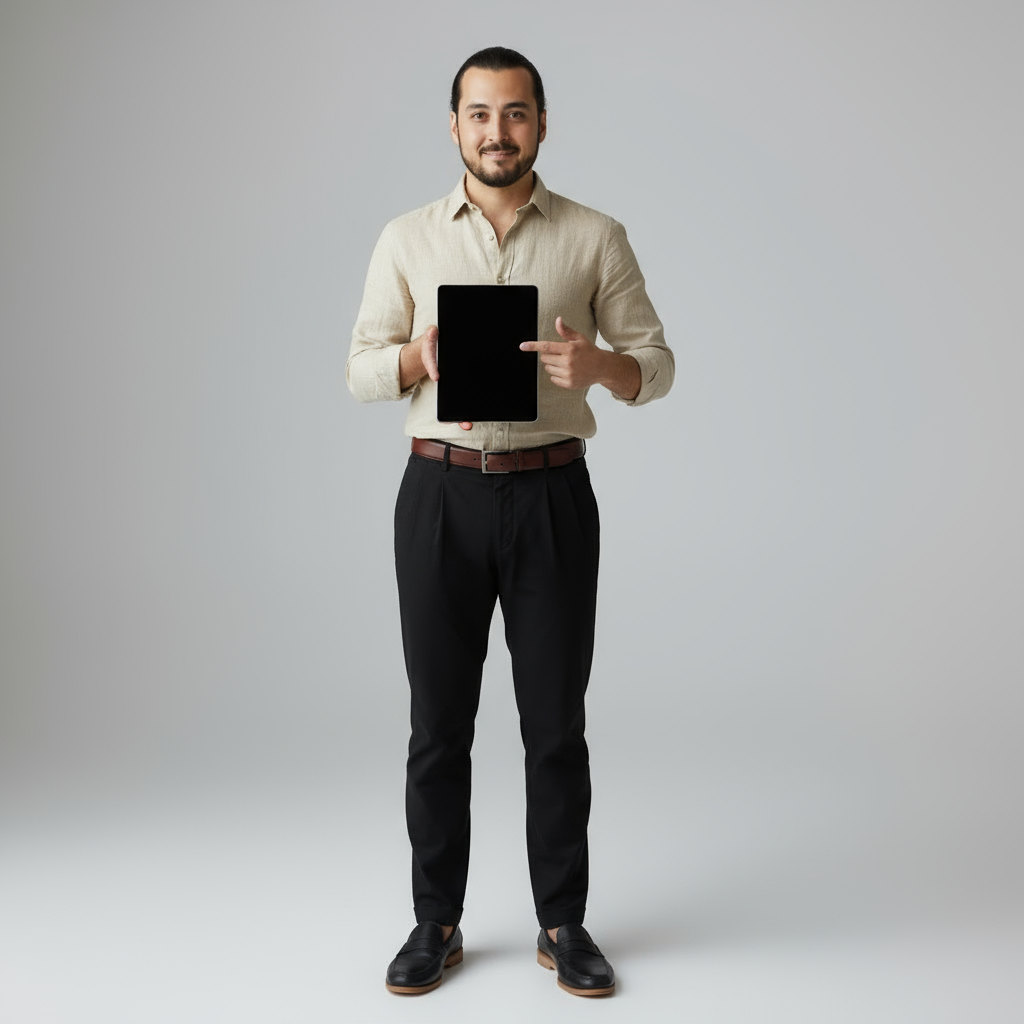 * der einen tablet hochformat, hält und ihn frontal der Kamera mit einem leichten Lächeln präsentiert. Der Tablet-Bildschirm ist schwarz (leer). mit einem finger zeigt er es auf dem Bildschirm, finger ragt ganz leicht über den bildschirm