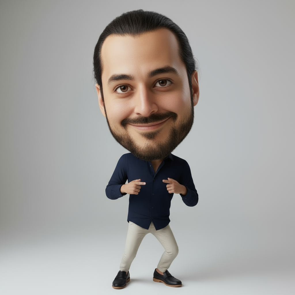 Erstelle eine hyperrealistische, karikaturistische 3D-Version der Figur aus dem beigefügten Bild, mit Proportionen im „Big Head“-Stil (großer Kopf und kleiner Körper).