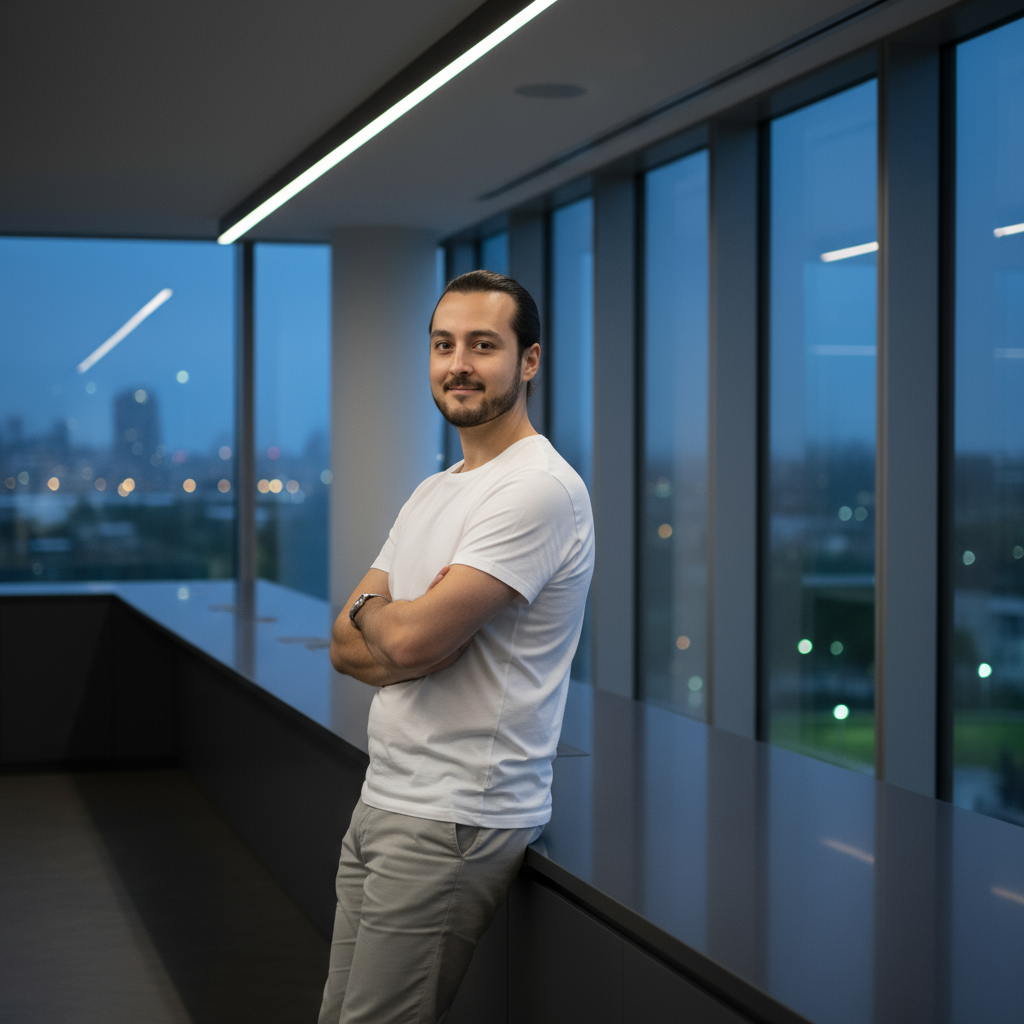 Ein sanft abgedunkelter, moderner Büroraum wird von zartem natürlichem Nachtlicht durchflutet, das durch die großen, raumhohen Fenster auf der rechten Seite hereinströmt und sanfte Reflexionen auf einer eleganten, langen grauen Theke wirft. Ein erwachsener kaukasischer Mann mit durchschnittlicher Statur steht in einem weißen T-Shirt und lehnt sich leicht gegen die Oberfläche.