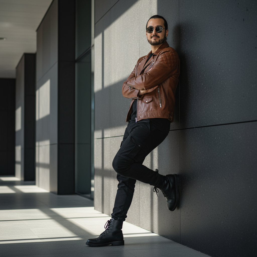 Verwenden Sie 100 % des Gesichts aus dem hochgeladenen Foto. Ein hyperrealistisches Ganzkörperporträt eines gutaussehenden 27-jährigen ägyptischen Mannes mit schwarzen Haaren und schwarzem Bart, wie auf dem hochgeladenen Foto, und Sonnenbrille. Er lehnt selbstbewusst an einer dunklen, modernen Architekturwand in einem sonnendurchfluteten Korridor. Er trägt eine detailgetreue braune Leder-Bikerjacke mit gesteppten Schultern, ein schwarzes T-Shirt mit Rundhalsausschnitt und eine schwarze, enge Cargohose mit