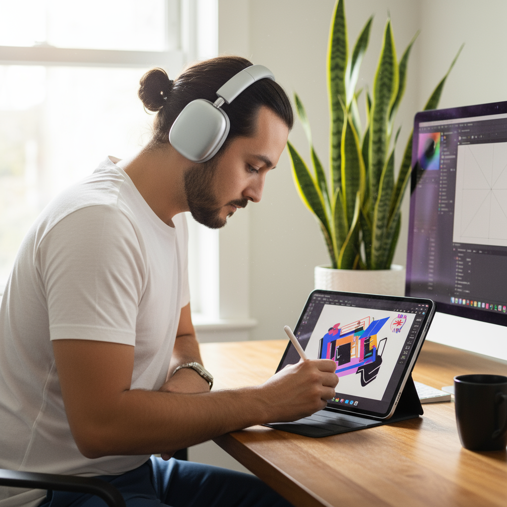 Er trägt ein weißes T-Shirt und eine Uhr und hält einen Stylus an eine Zeichnung auf dem iPad, während er auf seine Arbeit hinunterblickt. Im Hintergrund sind ein Computermonitor mit einer Designoberfläche, eine schwarze Tasse, eine Schlangenpflanze und ein sonnendurchflutetes Fenster zu sehen, die eine Homeoffice-Umgebung schaffen.