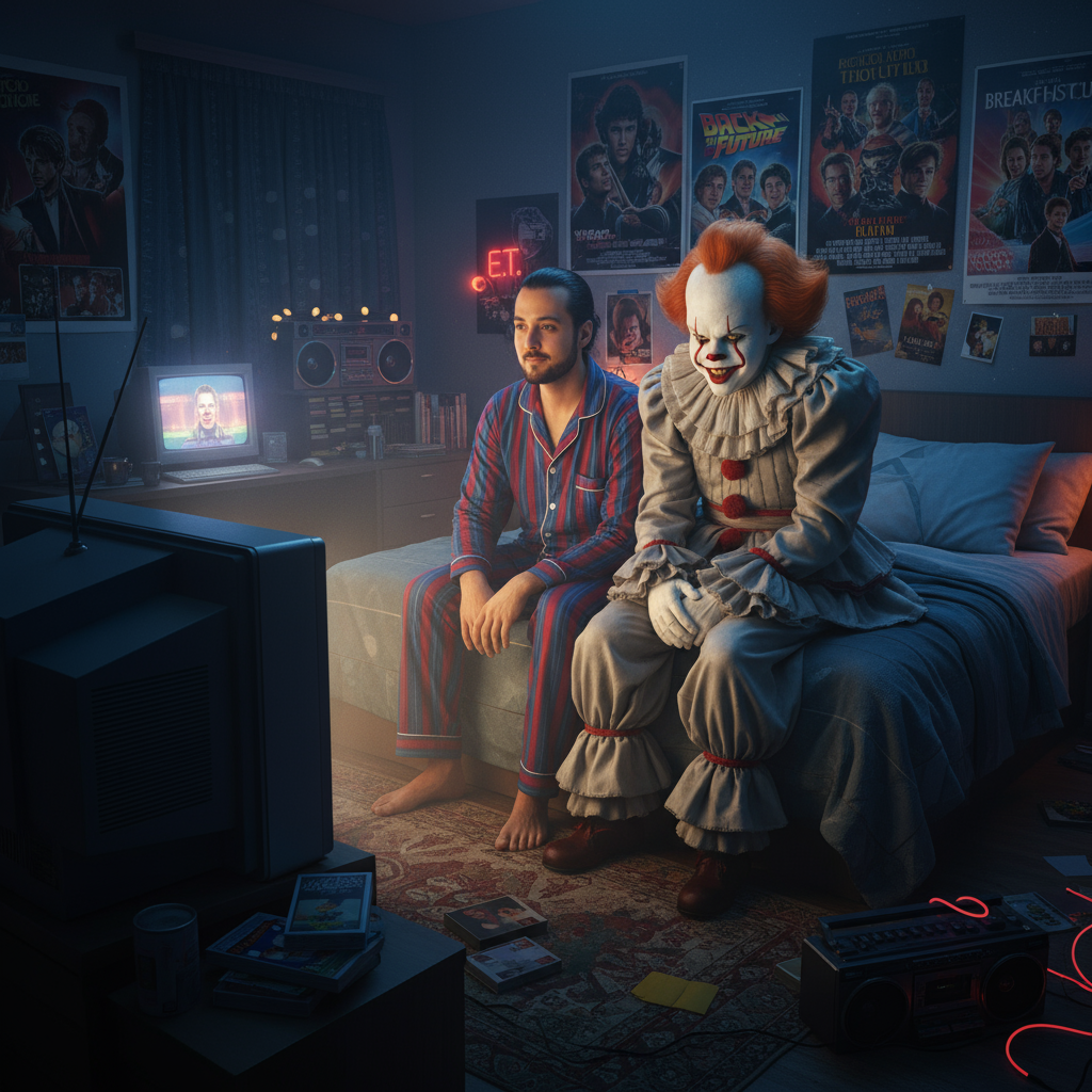 Next to them, Pennywise sits on the bed in a relaxed pose, as if both are watching the TV together.