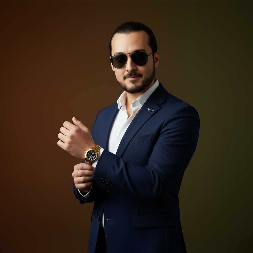 A confident man in a navy blue tailored suit with a white shirt, no tie, adjusting his cufflinks. He wears aviator sunglasses, a gold wristwatch, and a small lapel pin. The background is a smooth warm brown/olive studio backdrop with soft gradient lighting. Studio lighting is dramatic yet balanced, with a key light from the upper left casting subtle shadows. Editorial fashion portrait, waist-up, cinematic and luxurious style.