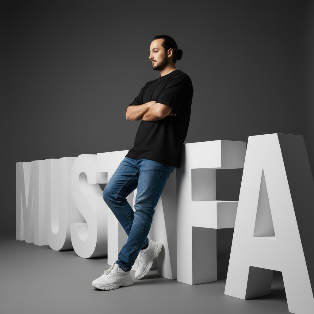 Der gesamte Stil ist monochromatisch, minimalistisch und zeitgenössisch Streetwear. Das Bild wurde aus einem niedrigen Winkel aufgenommen, wodurch meine Größe und Präsenz betont werden, während die skulpturalen MUSTAFA-Buchstaben im Hintergrund eine monumentale Erscheinung annehmen.