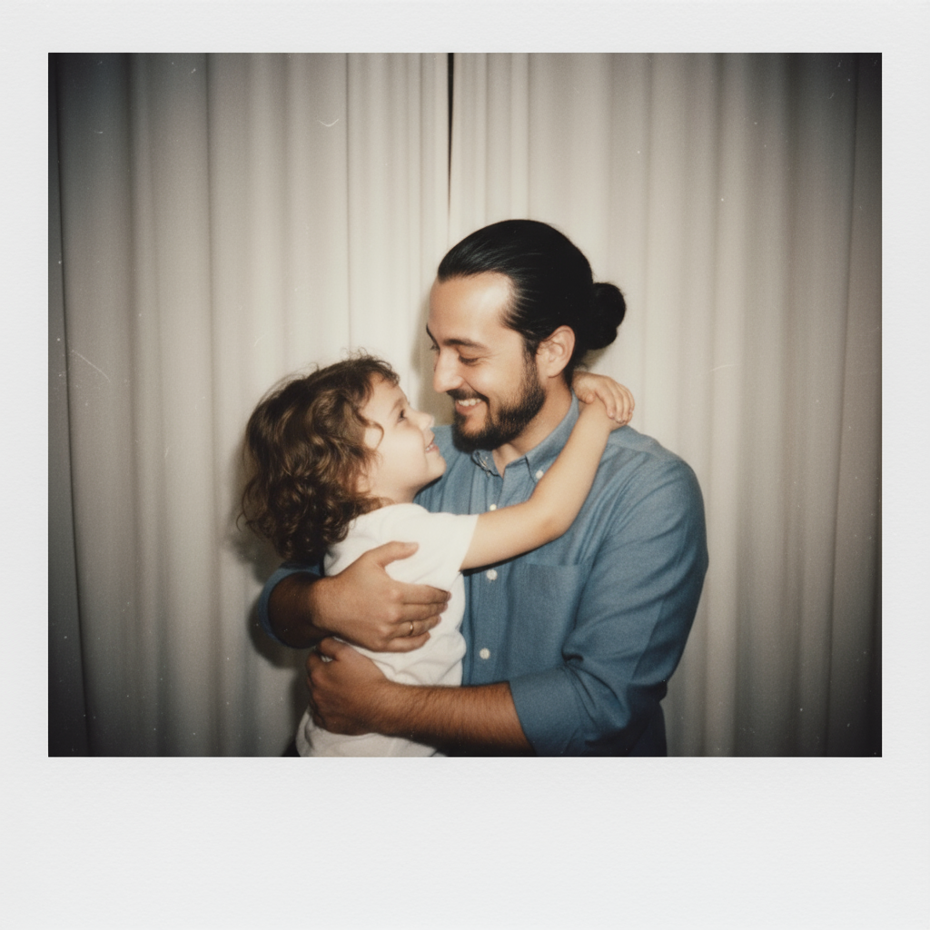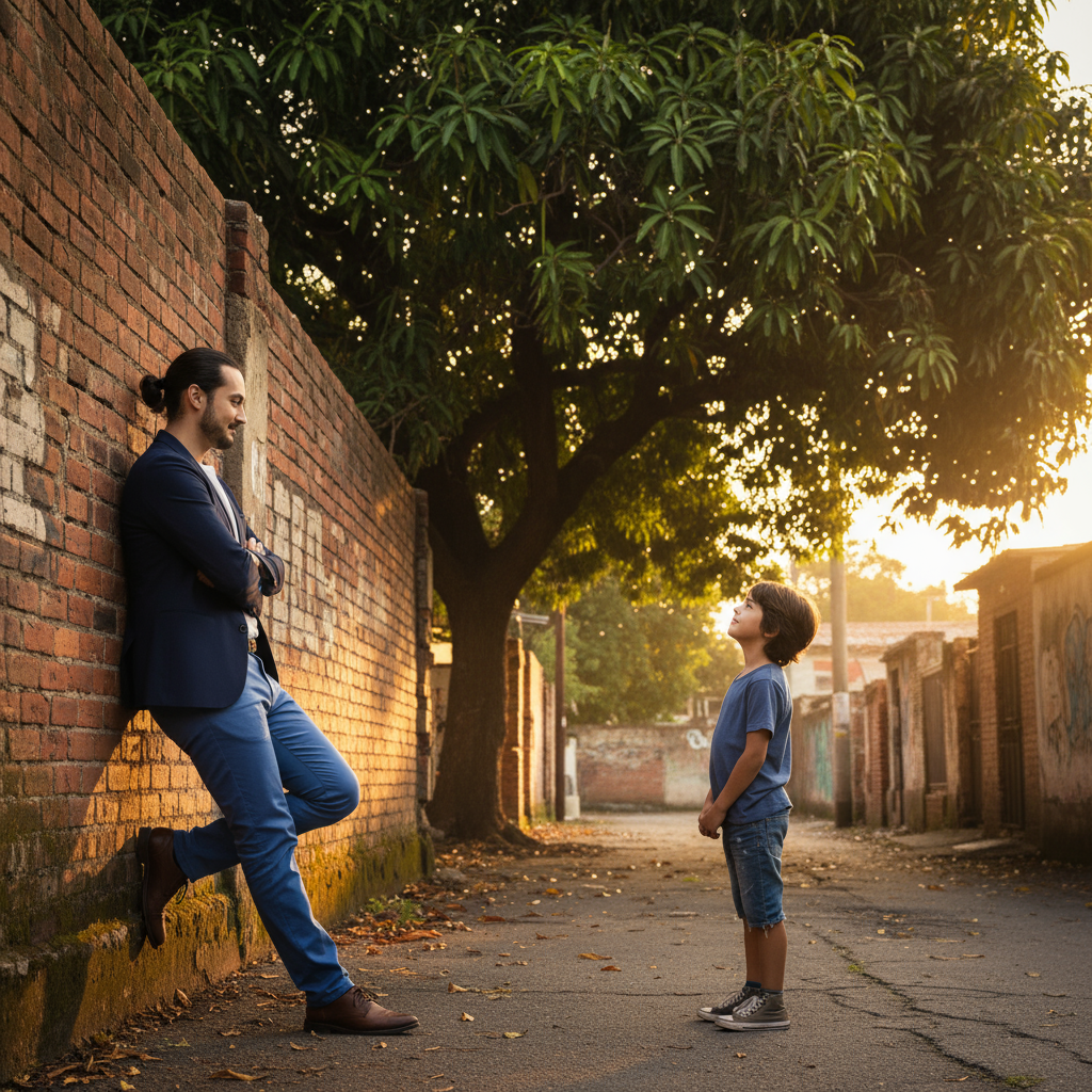 A cinematic, photorealistic full-body shot of an adult meeting his childhood self in an old residential alley with a large mango tree, captured from the side view. The adult leans against the alley wall, gazing softly at the child, while the child stands at a distance looking up at him with admiration. Both figures are shown in full body, with realistic proportions and natural posture. Warm golden hour sunlight streams from the side, casting long shadows and creating a nostalgic mood over the worn alley walls and glowing mango leaves. Replace both faces with the ones from the uploaded photos, keeping every detail of their hair, outfits, and accessories exactly as in the reference images. Vertical 9:16 ratio, realistic skin texture, natural expressions, cinematic lighting, and warm ton