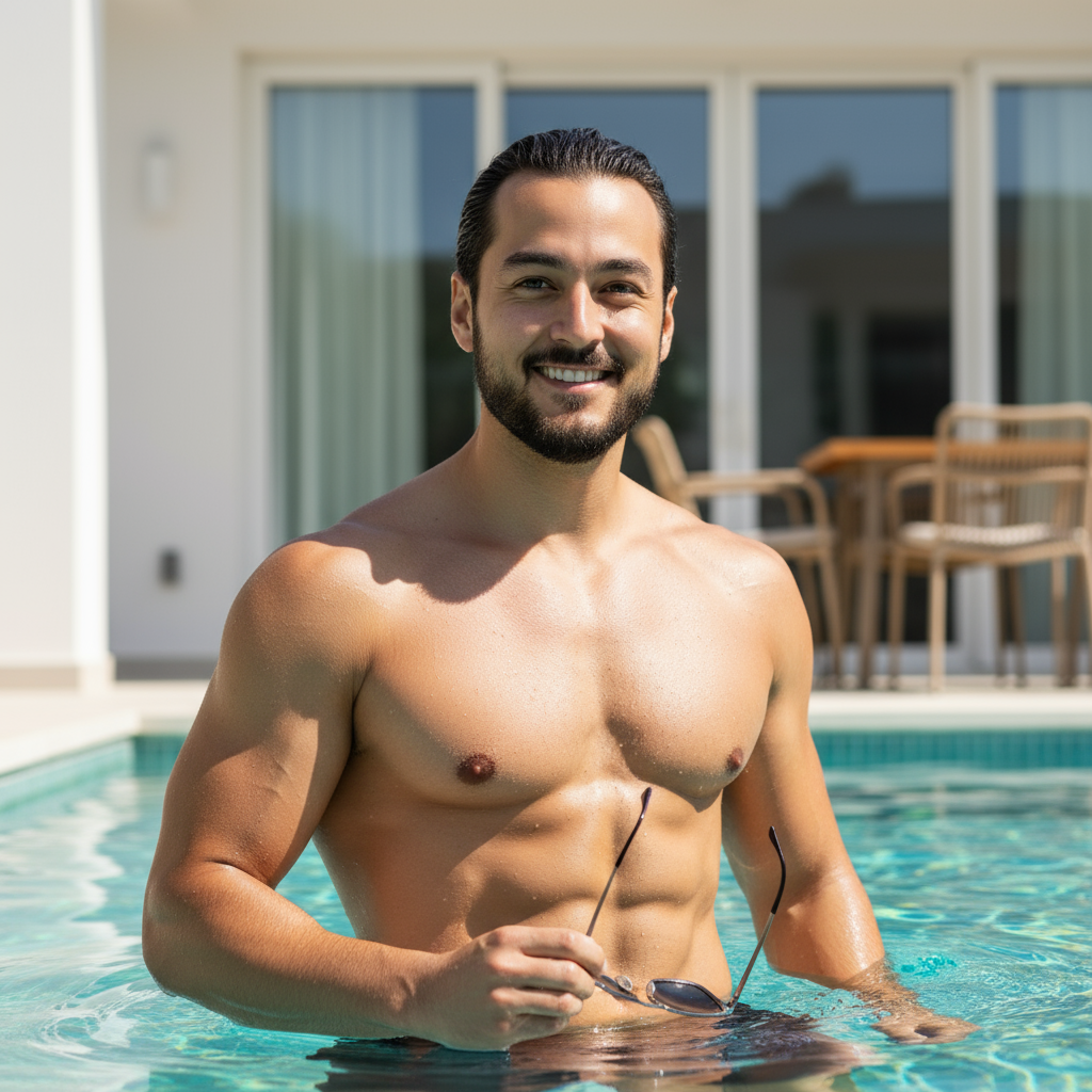 Ein hyperrealistisches Nahporträt eines muskulösen Mannes, der in einem Swimmingpool steht, wobei das Wasser bis knapp unter seine Brust reicht. Er hat kurzes dunkles Haar, einen gepflegten Bart und trägt eine Sonnenbrille, die er gerade in seiner rechten Hand hält und leicht von seinem Gesicht abgesenkt hat. Er lächelt breit und aufrichtig und schaut nach ins kamera., ein Körperbau ist außergewöhnlich definiert, mit ausgeprägten Brustmuskeln, Deltamuskeln und Bauchmuskeln, die alle unter dem hellen, natürlichen Sonnenlicht mit Wassertropfen glänzen.
