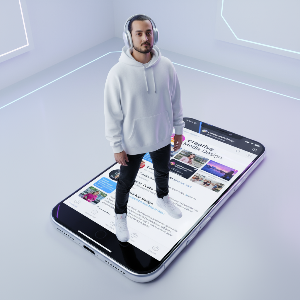 Er steht selbstbewusst vor dem riesigen Bildschirm eines iPhone 16, das auf dem Boden liegt. Auf dem Bildschirm wird instagram seite mit „creative Media Design” angezeigt. Er trägt AirPods Max 2025, einen übergroßen weißen Hoodie, eine schwarze Hose und strahlend weiße Air Jordans. Die Szene wird aus einem hohen Winkel von oben nach unten aufgenommen, um die Größe des Telefons hervorzuheben. Die Atmosphäre ist minimalistisch, stilvoll und futuristisch.