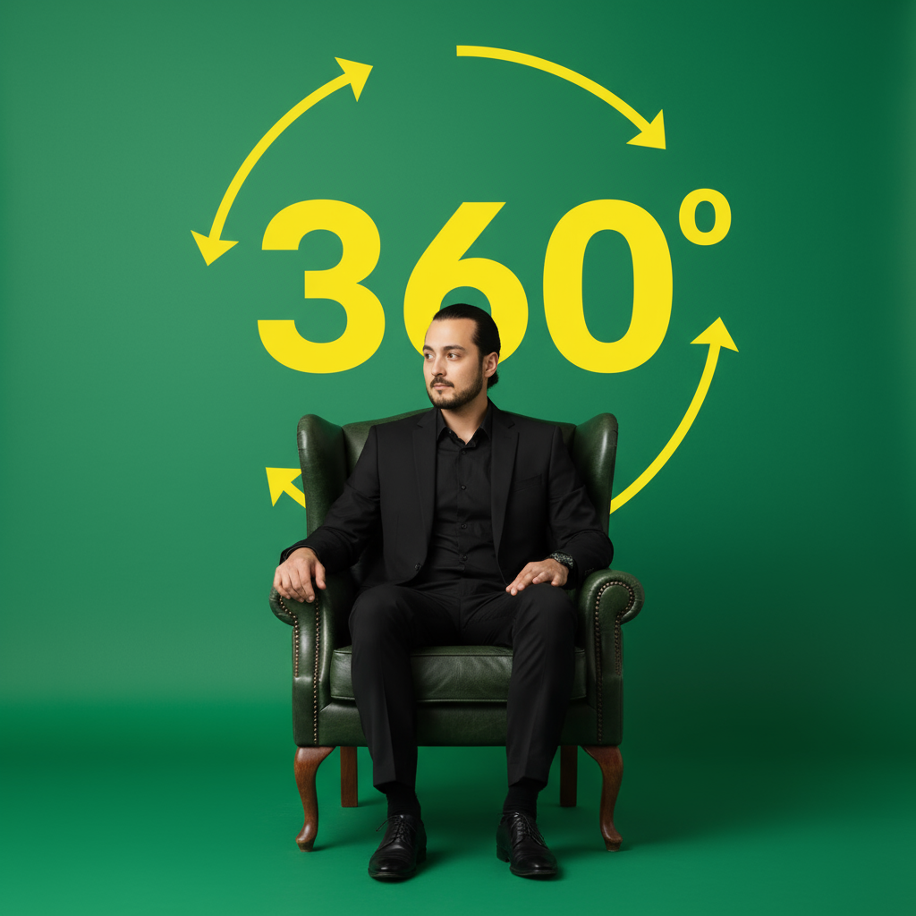 „Ein Mann sitzt auf einem eleganten dunkelgrünen Ledersessel mit Holzbeinen, trägt einen schwarzen Anzug mit schwarzem Hemd und blickt mit ernstem, professionellem Gesichtsausdruck zur Seite. Hinter ihm befindet sich ein einfarbiger grüner Hintergrund mit der großen gelben Zahl „360”, umgeben von kreisförmigen Pfeilen, die Bewegung oder eine vollständige Sicht darstellen.